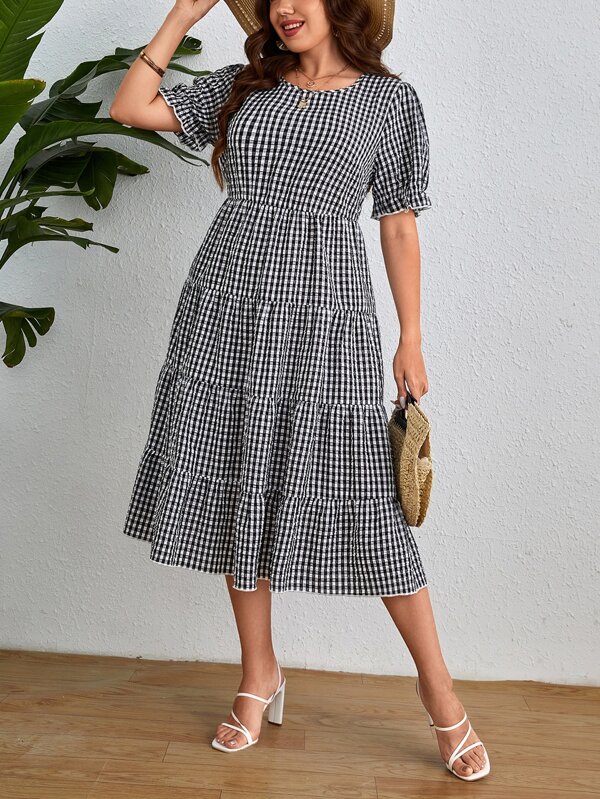 SHEIN Clasi Plus Gingham Print Puff Sleeve Ruffle Hem Dress