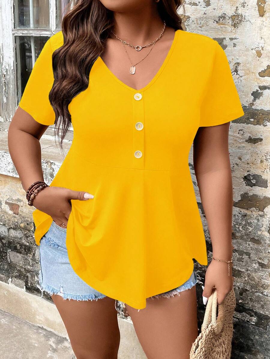 SHEIN LUNE Plus Half Button Curved Hem Tee