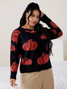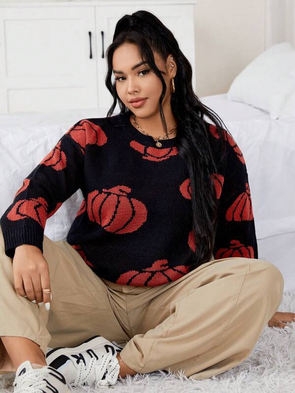 SHEIN Privé Plus Halloween Pumpkin Pattern Drop Shoulder Sweater