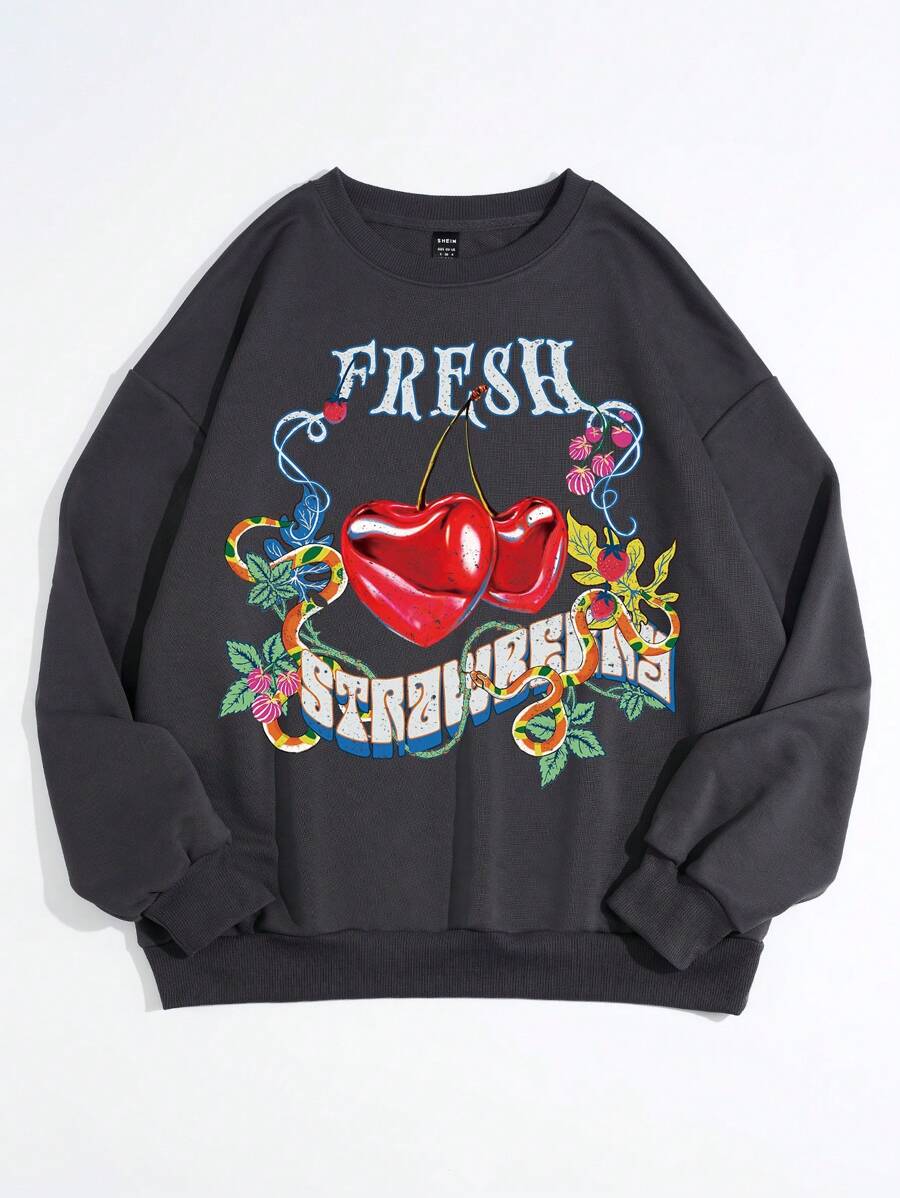 SHEIN Coolane Plus Size Women's Oversized Cherry & Letter Print Drop Shoulder Round Neck Pullover Sweatshirt