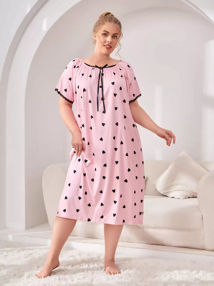Plus Heart Print Bow Front Lace Trim Night Dress