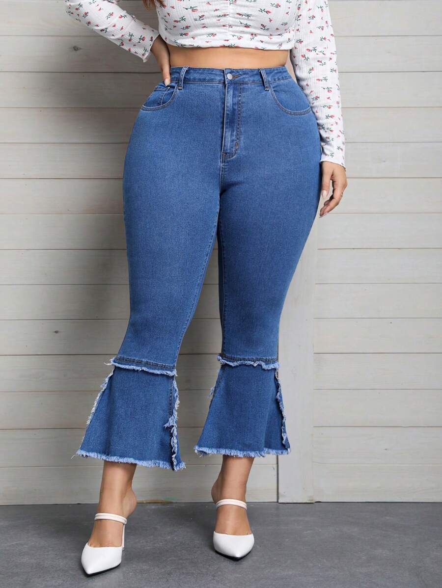SHEIN Privé Plus High Waist Raw Trim Flare Leg Jeans