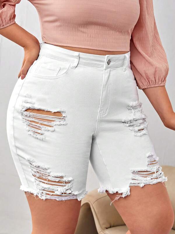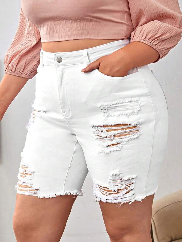 Plus High Waist Ripped Raw Hem Denim Shorts