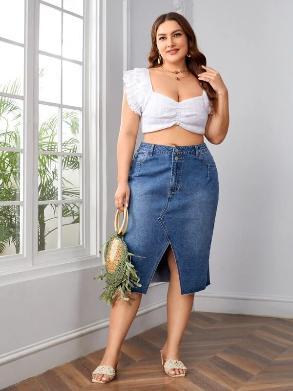 Plus High Waist Split Hem Denim Skirt
