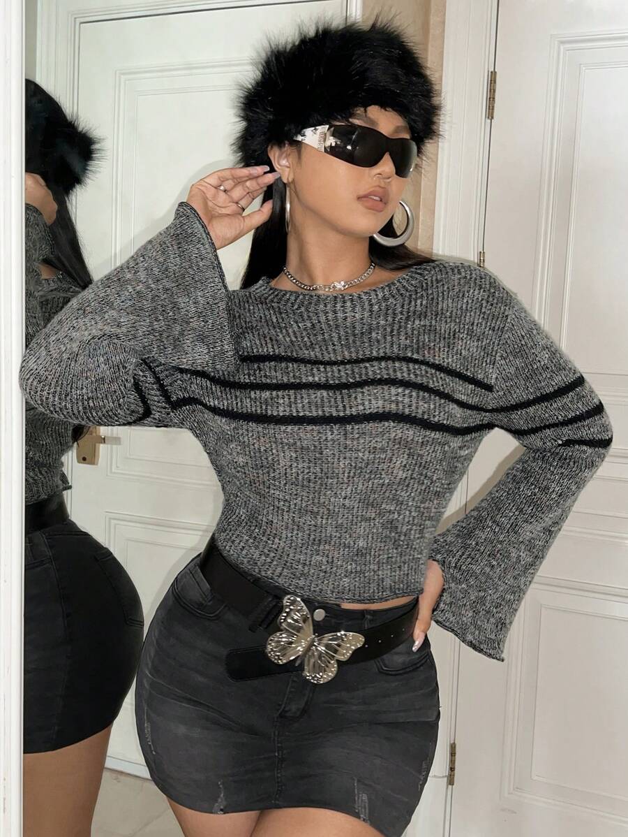 SHEIN ICON Plus Hippie Striped Pattern Trumpet Sleeve Sweater