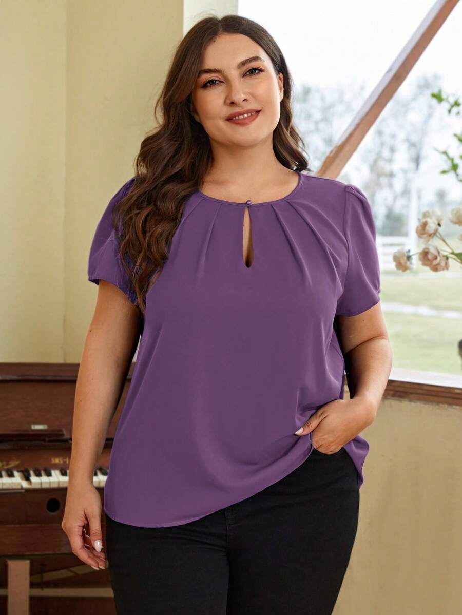 SHEIN Clasi Plus Keyhole Neck Plicated Detail Puff Sleeve Top