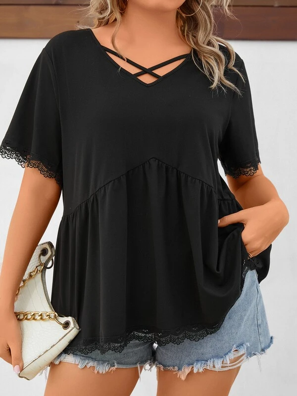 SHEIN LUNE Plus Lace Trim Crisscross Front Peplum Tee