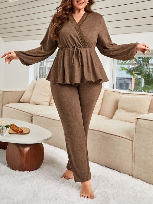 Plus Lace Trim Lantern Sleeve Knot Front Peplum Top & Pants PJ Set