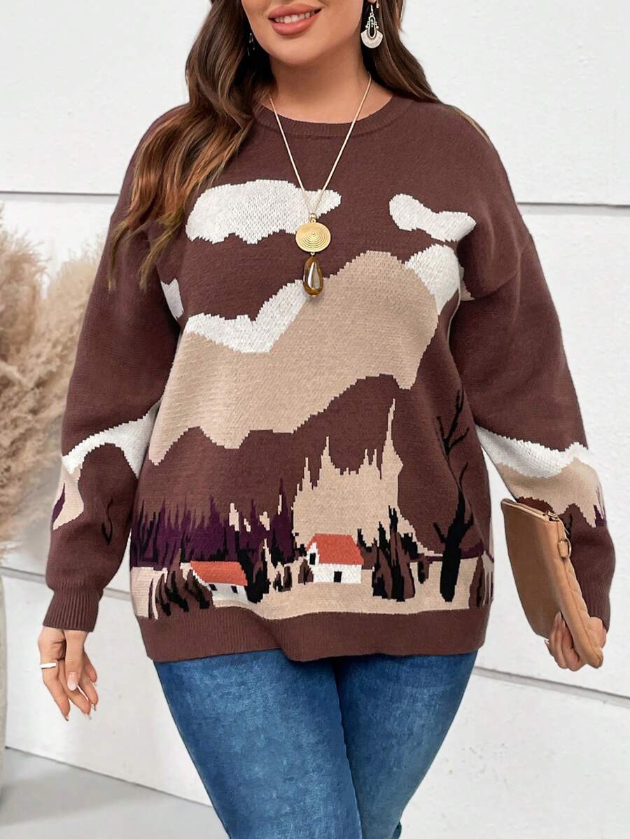EMERY ROSE Plus Landscape Pattern Drop Shoulder Sweater
