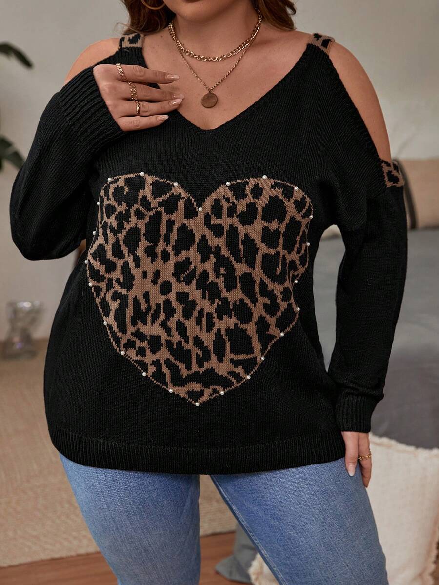 SHEIN LUNE Plus Leopard & Heart Pattern Cold Shoulder Sweater
