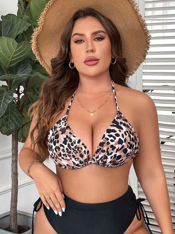 SHEIN Swim Vcay Plus Leopard Print Tie Backless Halter Push Up Bikini Top