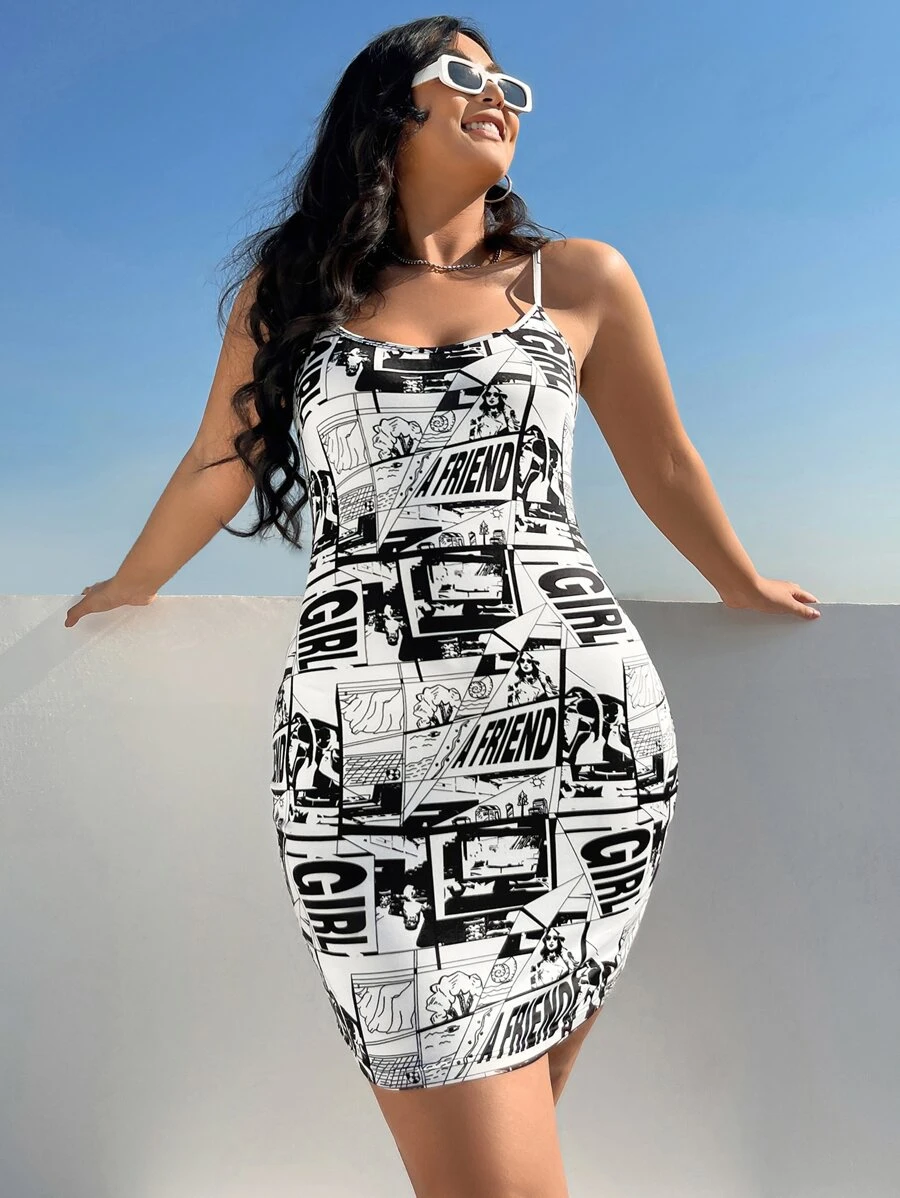 SHEIN Coolane Plus Letter & Figure Graphic Cami Bodycon Dress