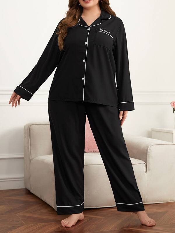 Plus Letter Embroidery Contrast Piping Patched Pocket PJ Set