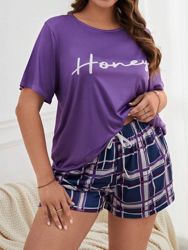 Plus Letter Graphic Tee & Plaid Shorts PJ Set