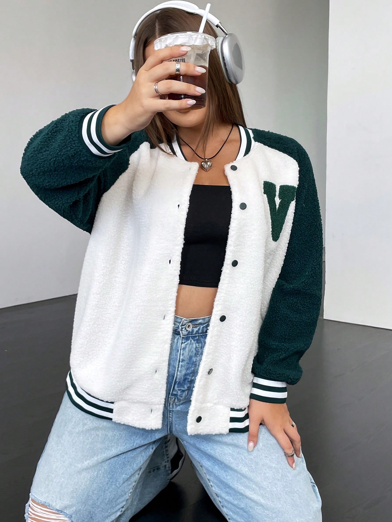 SHEIN EZwear Plus Letter Patched Striped Trim Raglan Sleeve Teddy Varsity Jacket