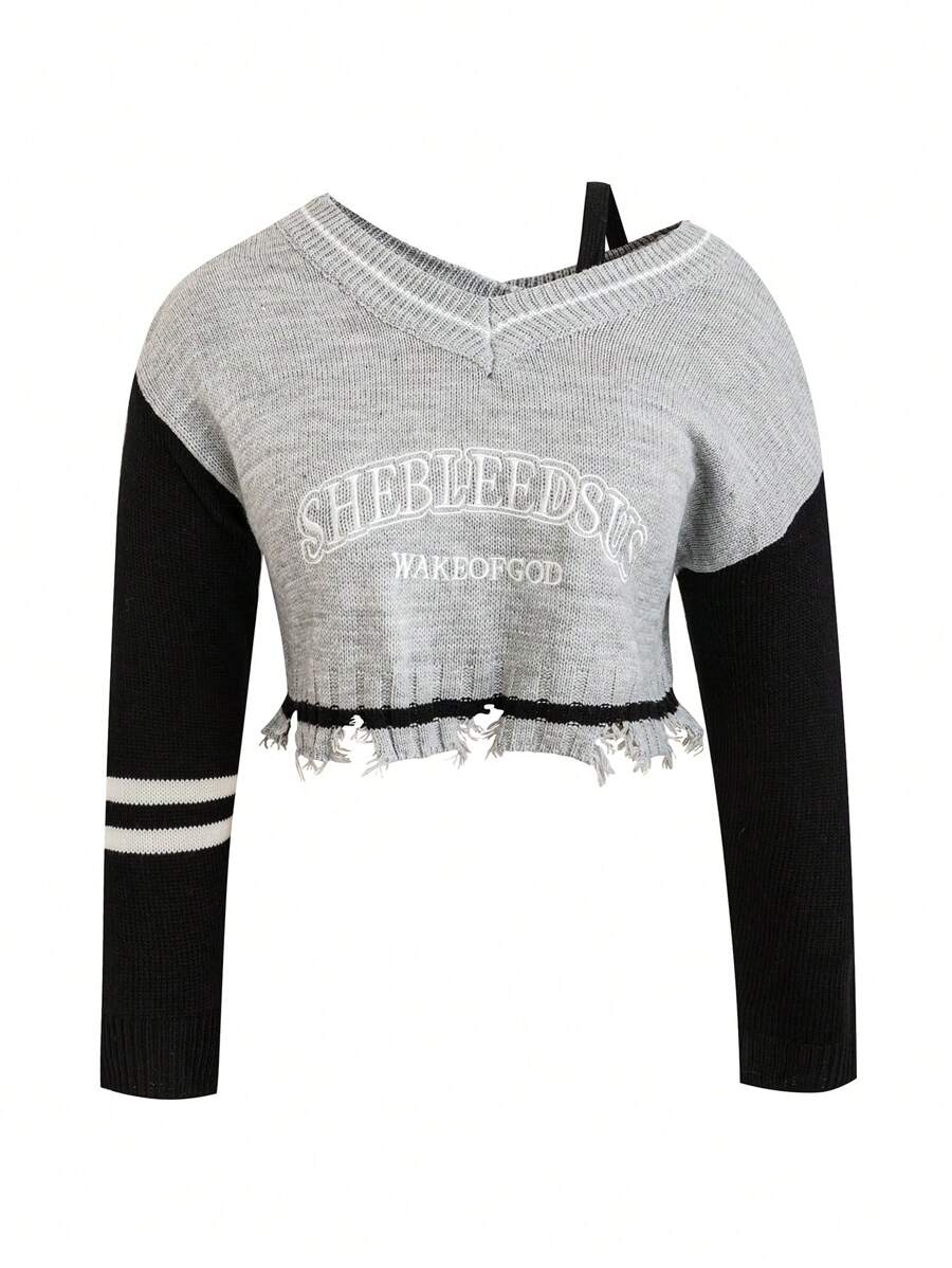 SHEIN SXY Plus Letter Pattern Colorblock Drop Shoulder Distressed Crop Sweater