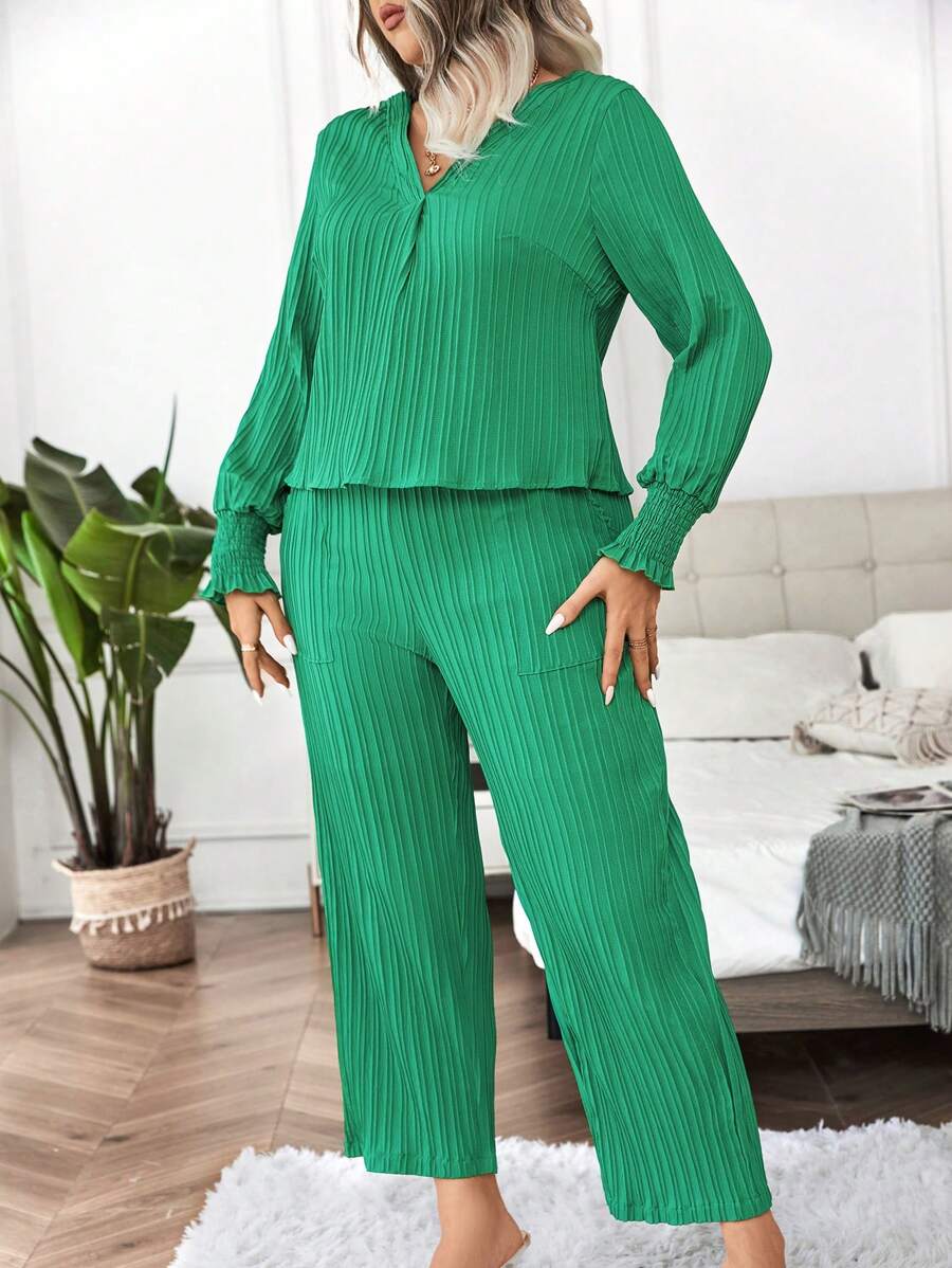 SHEIN Essnce Plus Lettuce Trim Top & Wide Leg Pants