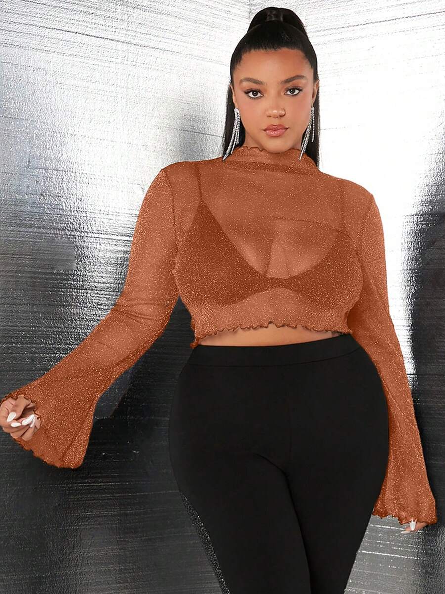 SHEIN SXY Plus Mock Neck Lettuce Trim Mesh Top Without Bra