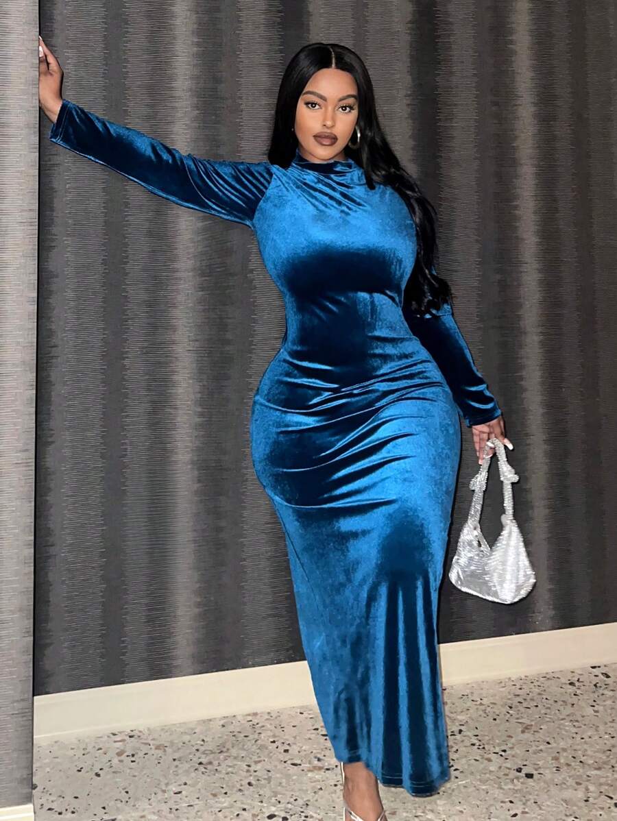 SHEIN Slayr Slayr Plus Size Elegant Casual Solid Color Slim Fit Velvet Maxi Dress With Turtleneck And Back Slit
