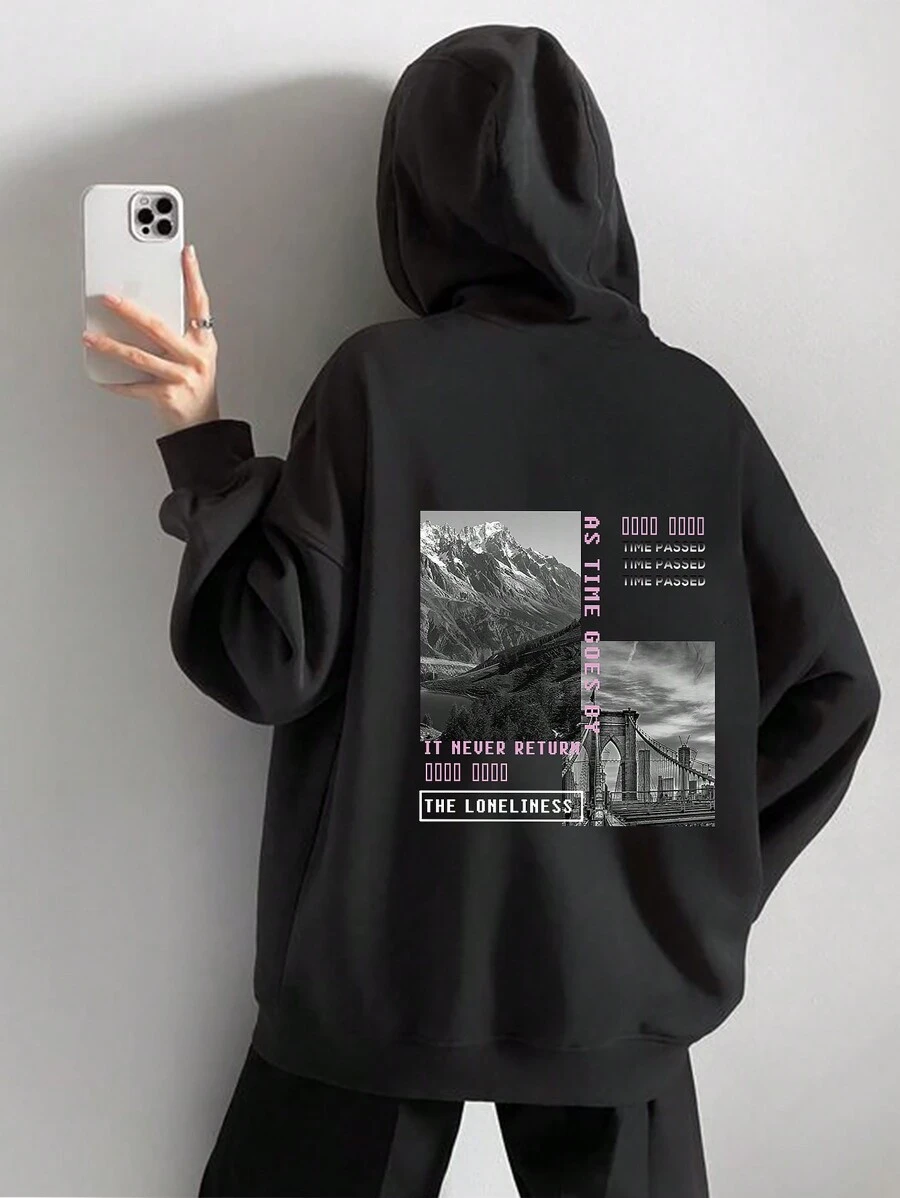 Plus Mountain & Slogan Graphic Drawstring Thermal Lined Hoodie