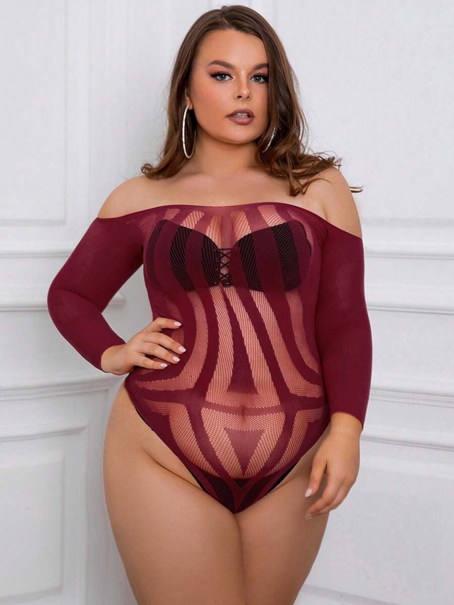 Plus Off Shoulder Hollow Out Fishnet Teddy Bodysuit Without Liner