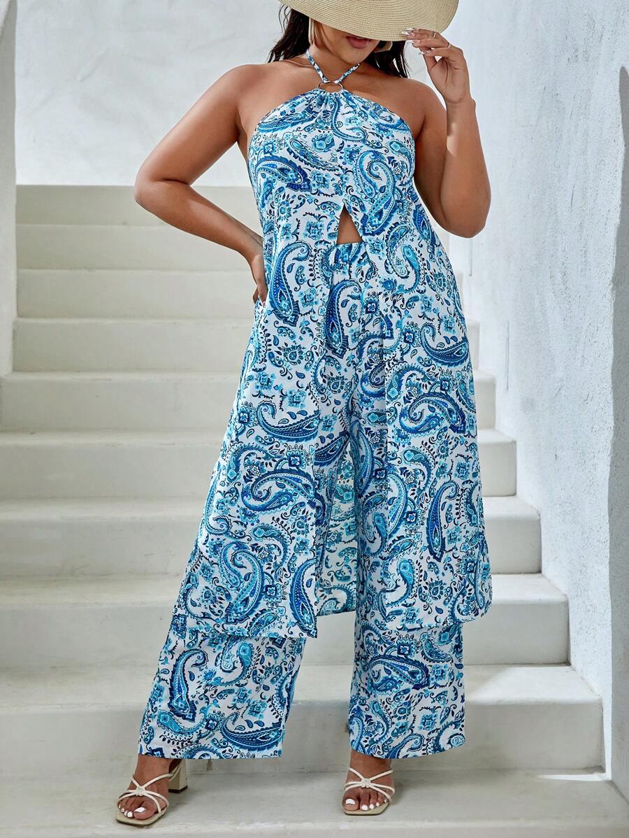 SHEIN VCAY Plus Paisley Print Halter Top & Wide Leg Pants