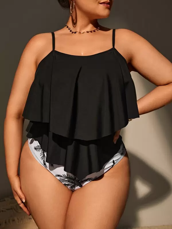 SHEIN Swim Classy Plus Palm Tree Print Tankini Set Two Layered Flowy Swim Cami Top & Bikini Bottom 2 Piece Bathing Suit