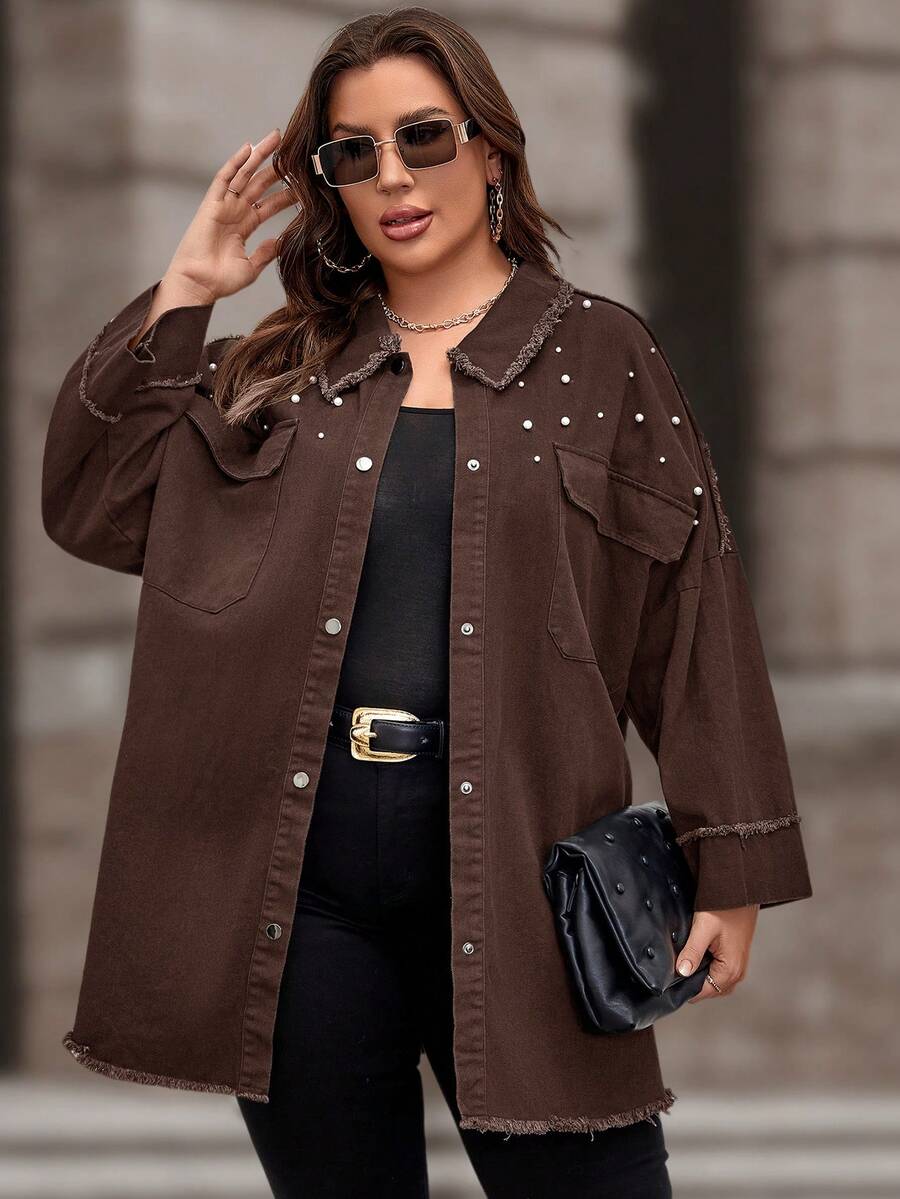 SHEIN LUNE Plus Pearls Beaded Drop Shoulder Raw Trim Coat