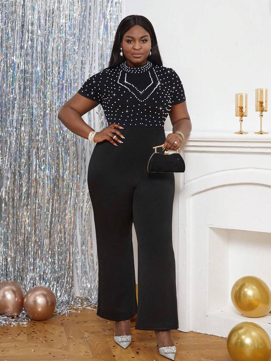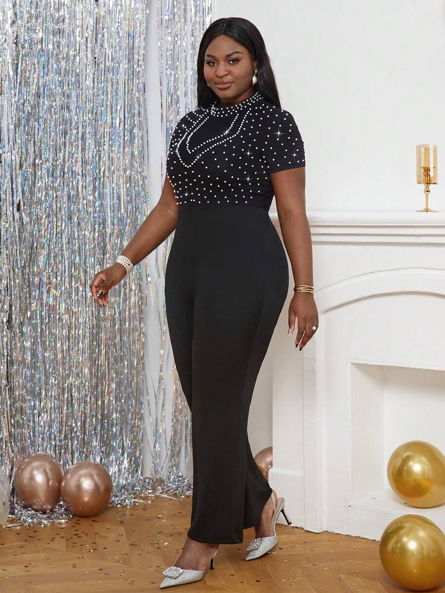 SHEIN Lady Plus Pearls Beaded Mock Neck Jumpsuit