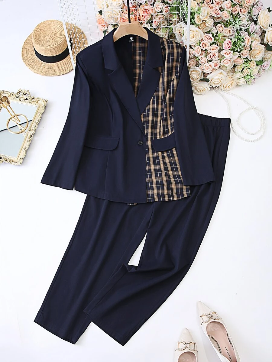 SHEIN Mulvari Plus Plaid Print Blazer & Pants