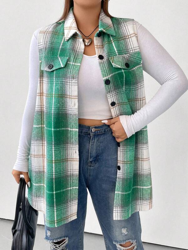 SHEIN LUNE Plus Plaid Print Flap Detail Vest Coat