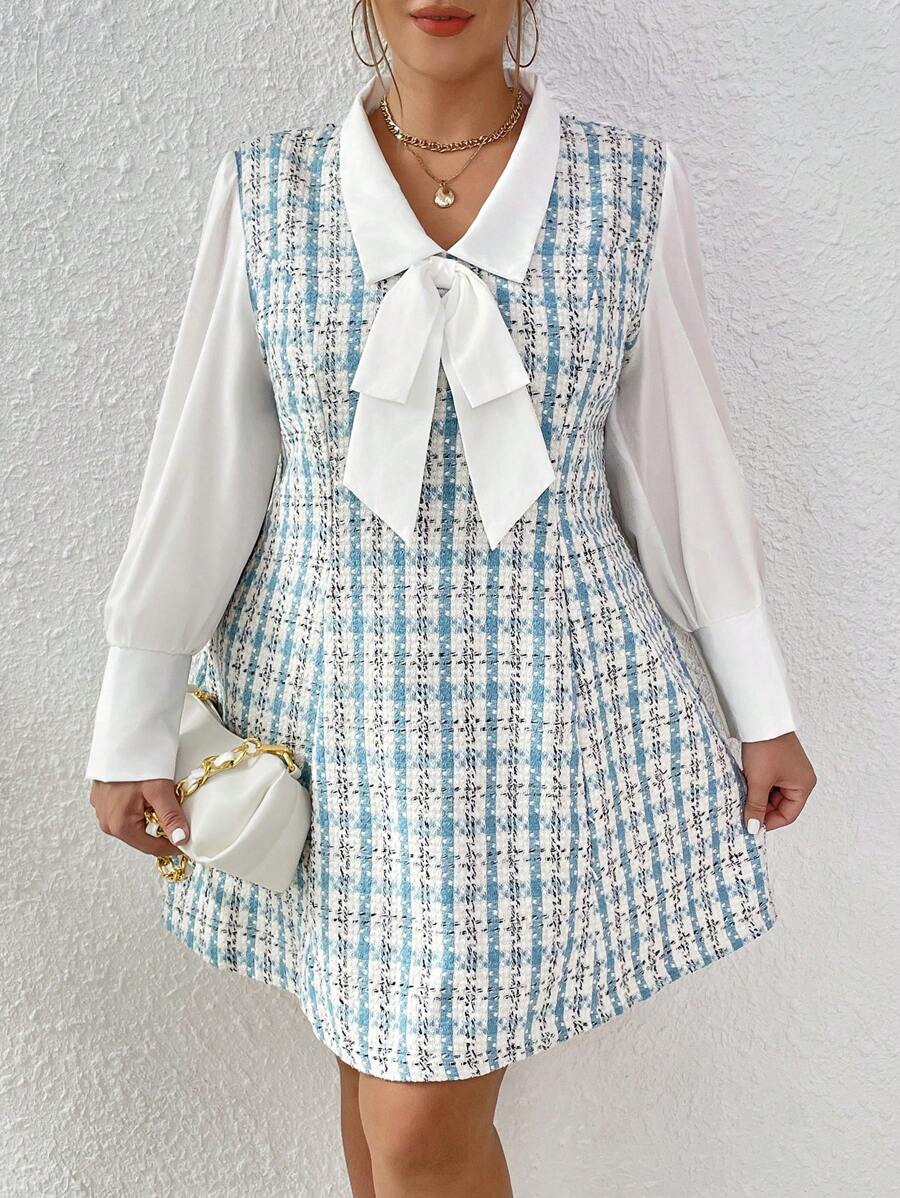 SHEIN Frenchy Plus Plaid Print Tie Neck 2 In 1 Dress