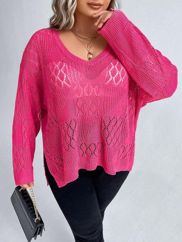 SHEIN LUNE Plus Pointelle Knit Drop Shoulder Split Hem Sweater Without Bra