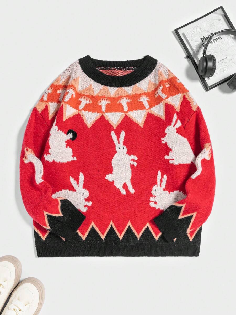 Plus Rabbit & Geo Pattern Drop Shoulder Sweater