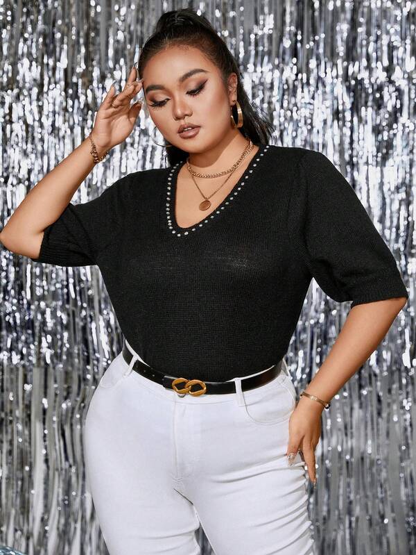 SHEIN Privé Plus Rhinestone Detail Knit Top