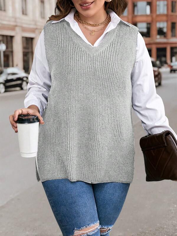SHEIN LUNE Plus Ribbed Knit Split Hem Sweater Vest Without Shirt