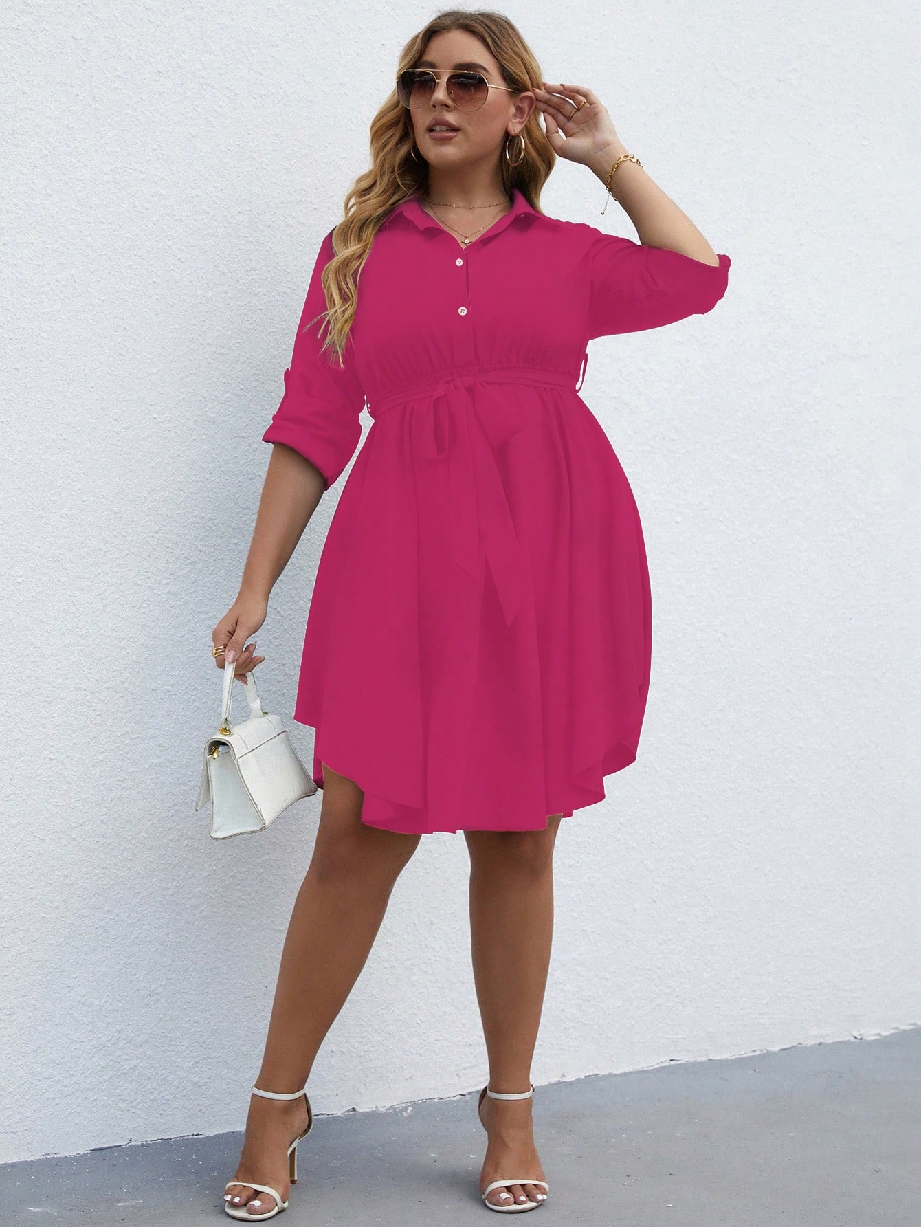 SHEIN Essnce Plus Roll Tab Sleeve Belted Shirt Dress