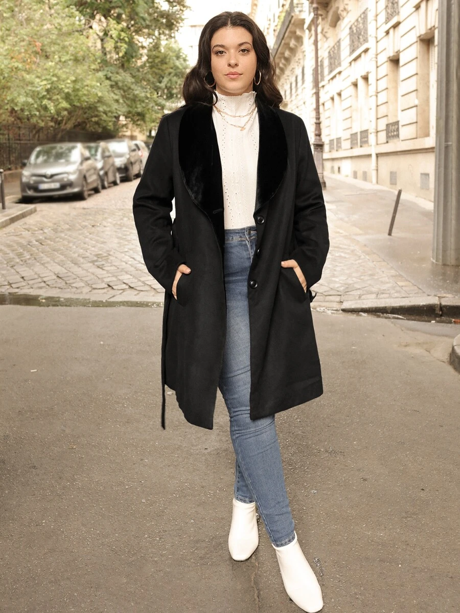 SHEIN Unity Plus Shawl Collar Button Front Belted Overcoat