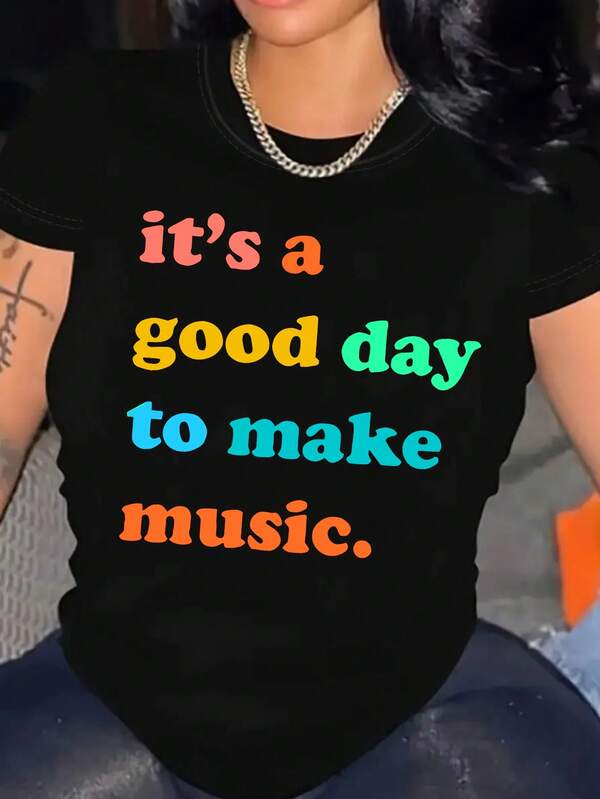 SHEIN LUNE Plus Size Casual Short Sleeve T-Shirt With Slogan Print And Round Neckline