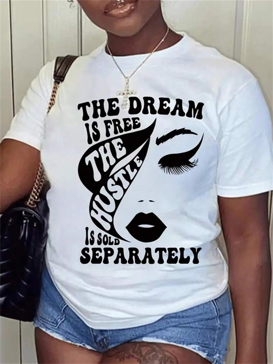 Plus Size Casual Short Sleeve T-shirt With Text Printed Round Neckline