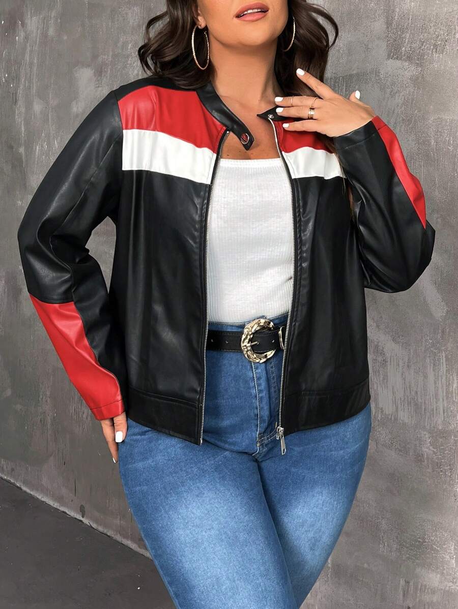 SHEIN Frenchy Plus Size Color Block Pu Leather Jacket