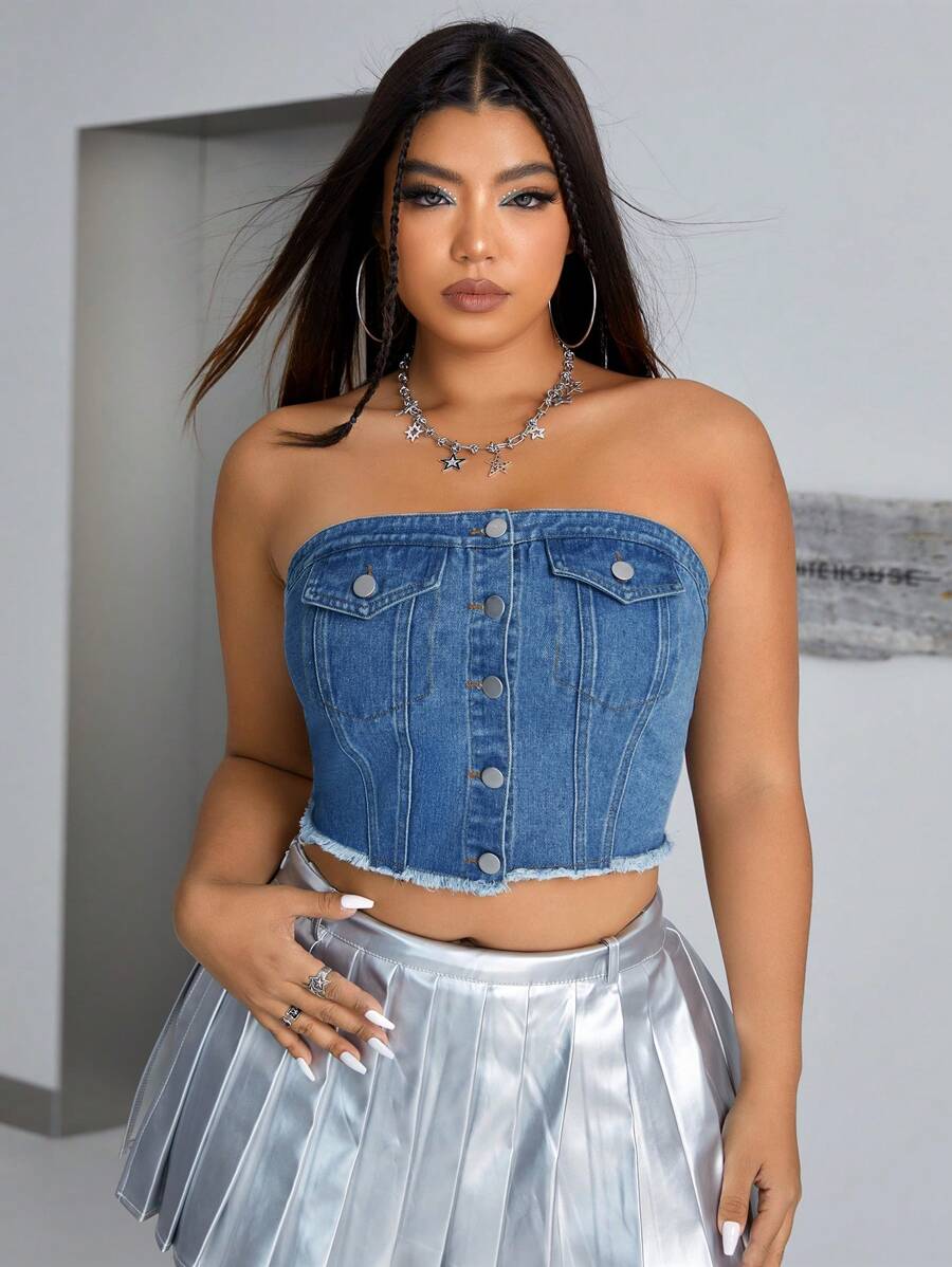 SHEIN ICON Plus Size Denim Halter Top With Flap Detail, Fringed Hemline