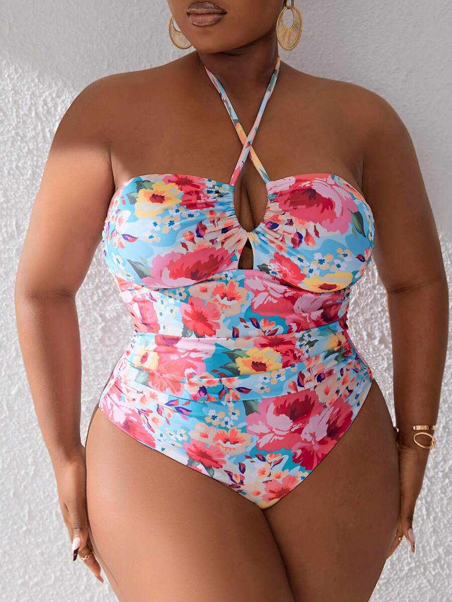 SHEIN Swim Vcay Plus Size Floral Print Halter Neck Backless One-Piece Swimsuit