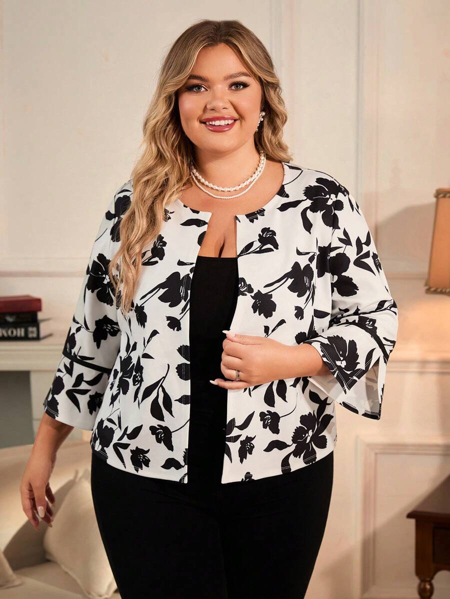 SHEIN Clasi Plus Size Floral Printed Open-front Jacket