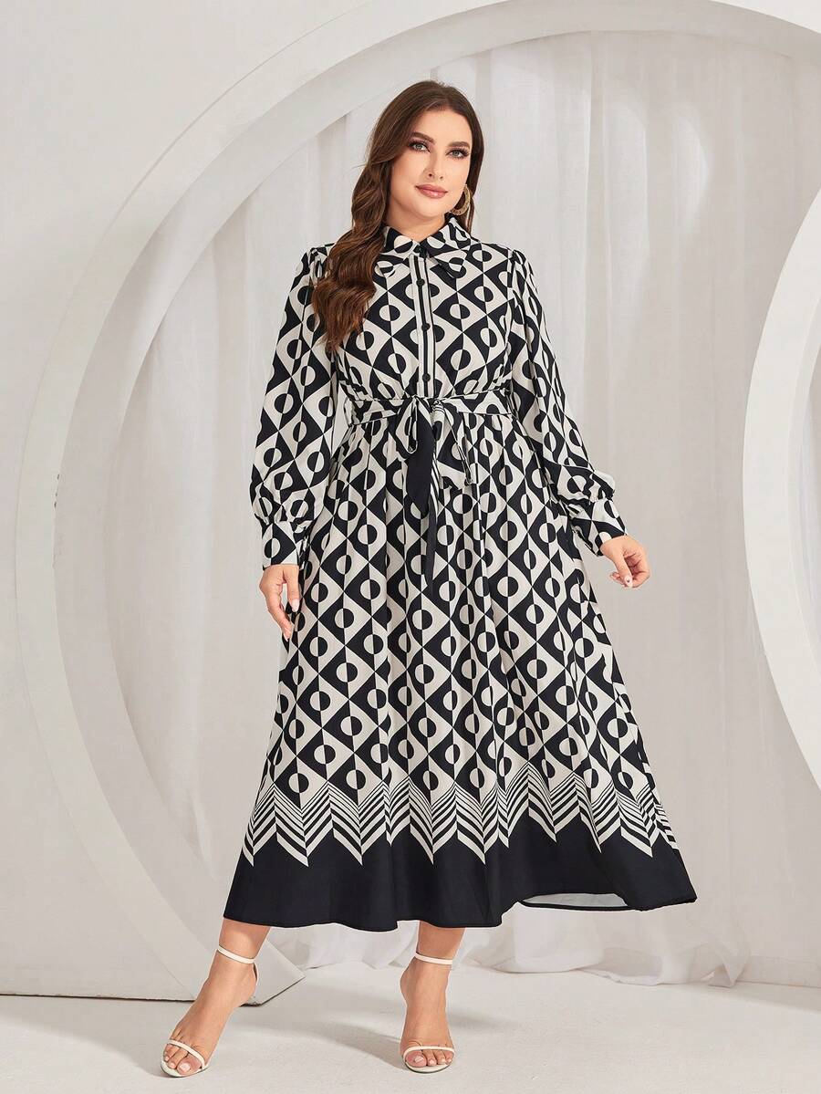 SHEIN Mulvari Plus Size Geometric Pattern Belted Shirt Dress