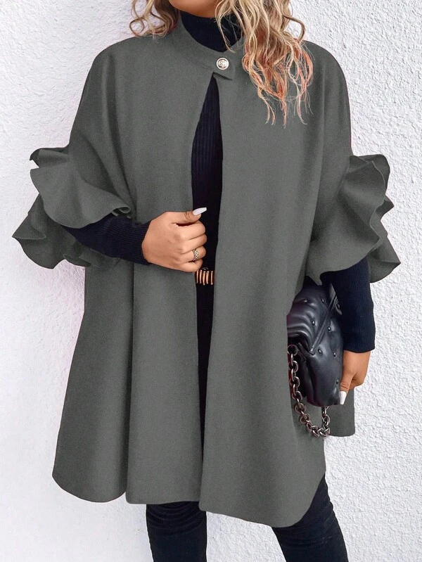 Plus Size Grey Coat With Button Design And Lace Sleeves