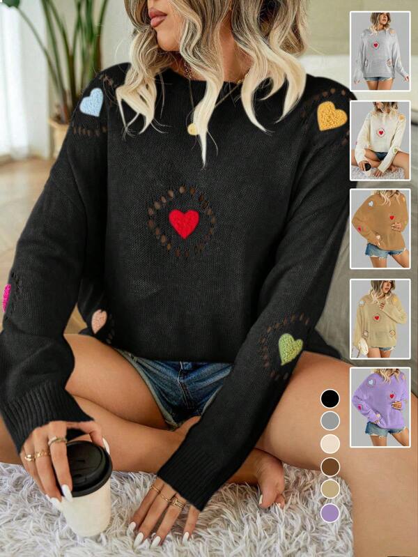 SHEIN Essnce Plus Size Heart Embroidery Drop Shoulder Round Neck Sweater