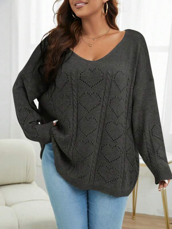 SHEIN LUNE Plus Size Hollow Out Heart Knitted Pullover Sweater