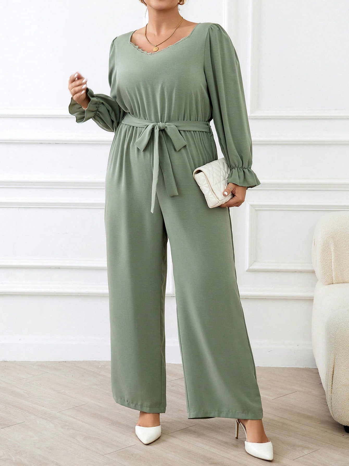 SHEIN Frenchy Plus Size Lace Patchwork Jumpsuit With Ruffle Sleeves