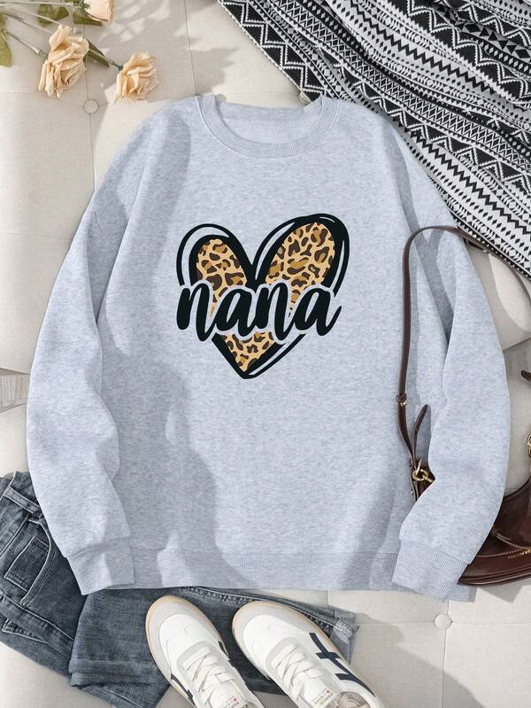 Plus Size Leopard Print Heart & Letter Patterned Fleece Lined Sweatshirt For Winter